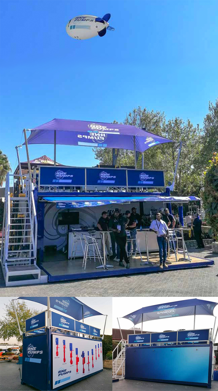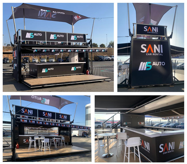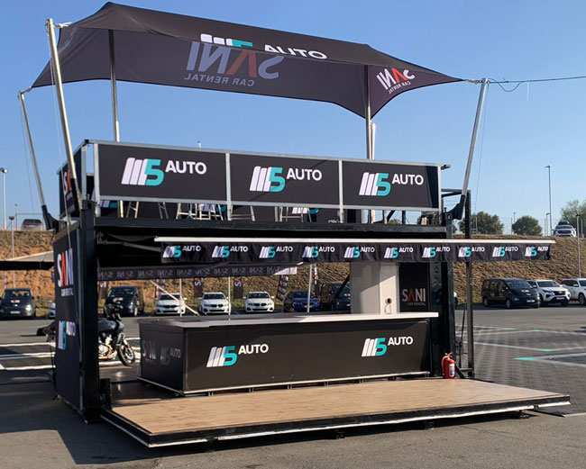 Supply event container using existing fabric graphics from 2022 show. In addition, a 5 metre blimp that flew 45 metres high, which could be seen everywhere at Nasrec.